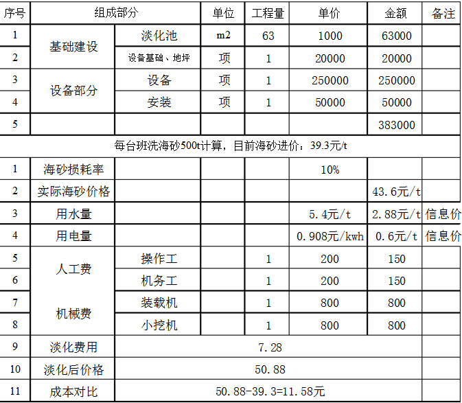 海砂清洗机能很好的将海沙通过日皮视频在线观看清洗达到淡化,完全达到国家施工质量标准(氯离子含量≤0.06%),海沙淡化投资项目既有很好的社会效益、生态效益,更是达到大经济效益。那么海沙淡化成本有多高?下面是海砂淡化成本估算图